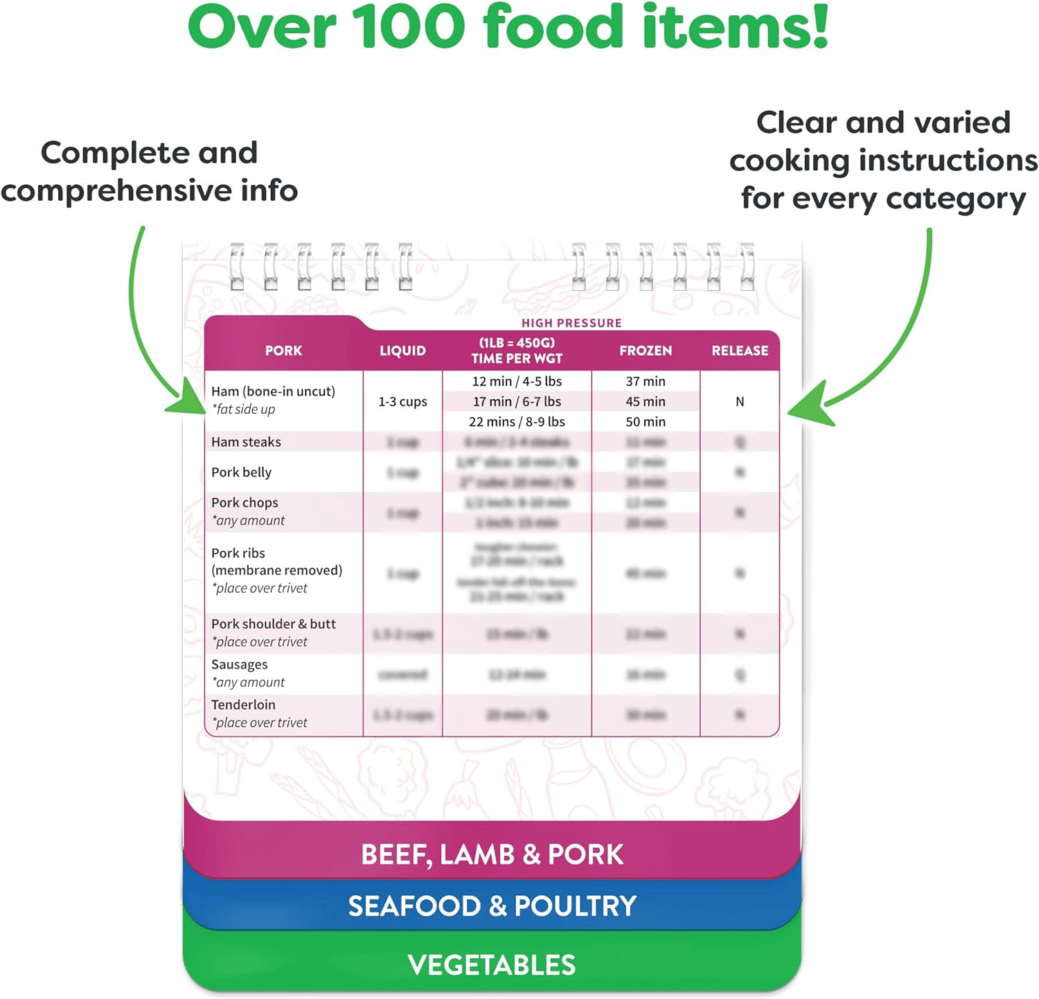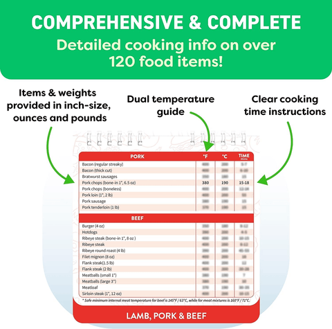 - Over 120+ food entries in 5 categories: Bakery, Desserts & Snacks, Poultry & Seafood, Lamb, Pork & Beef, Legumes & Vegetables, Frozen Section. Comprehensive Air Fryer Accessories. Well-researched accurate info at the flip of a finger so you can conveniently instantly find ideal cooking times without needing the internet.