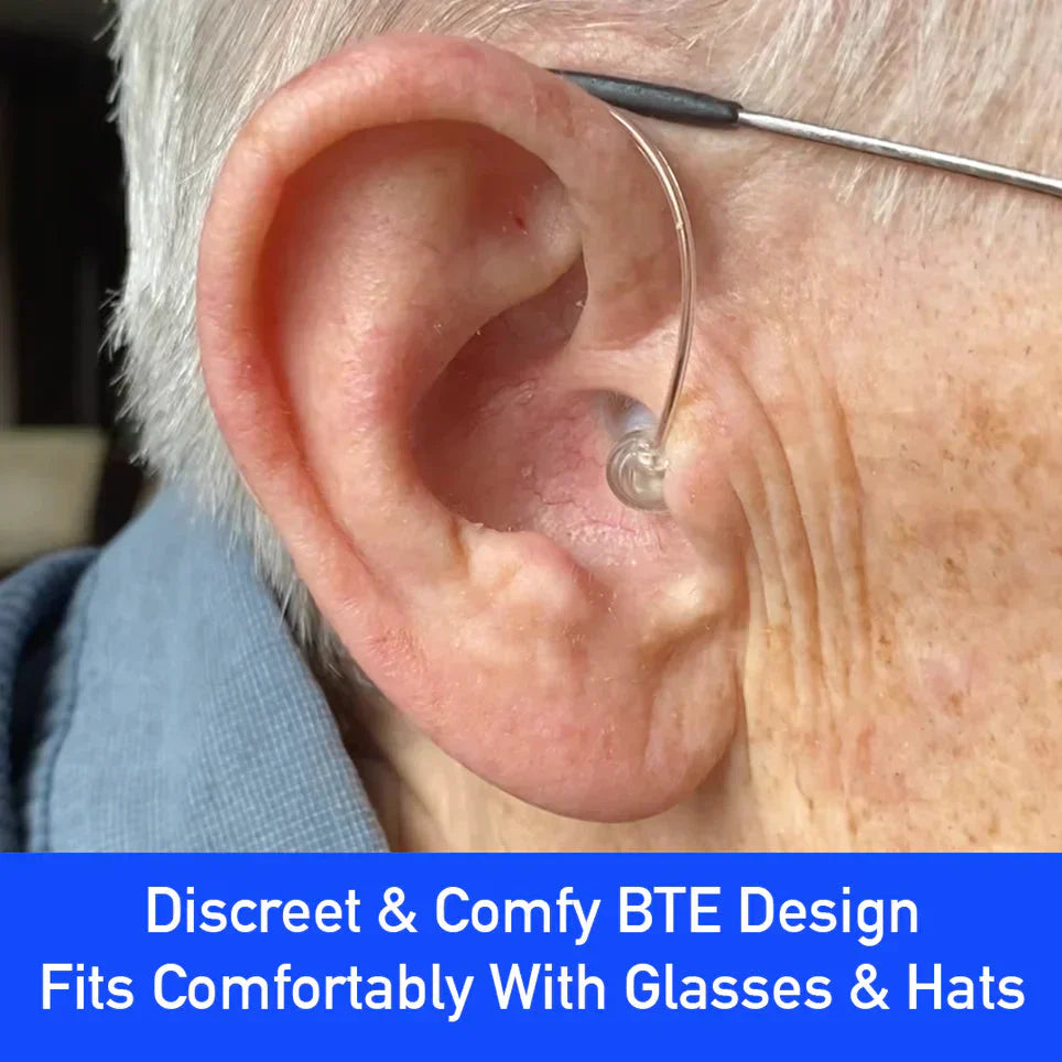 Even though our hearing aids use a BTE (behind-the- ear) design, they’re surprsingly discreet! On top of that, they’re extremely comfortable and won’t rub against your skin or get in the way of your glasses. The ear-tips/domes are made of ultra-soft silicone, which is gentle & comfy even on the most sensitive of skin. As for fitment, 4 sizes of form-fitting ear-tips/domes are included in your order to make sure your new hearing aids fit you perfectly.