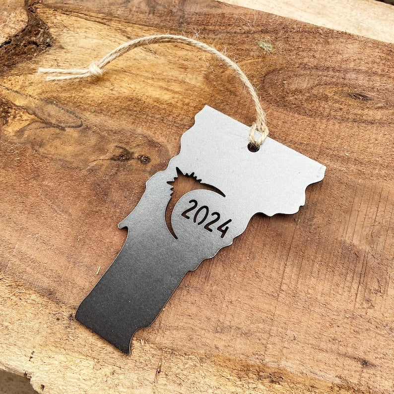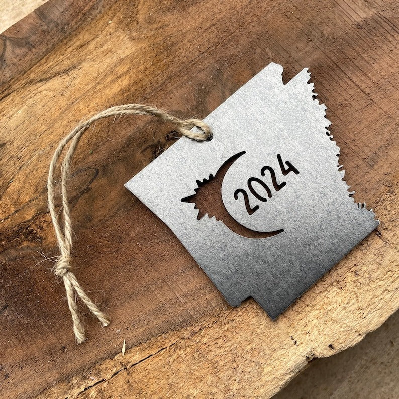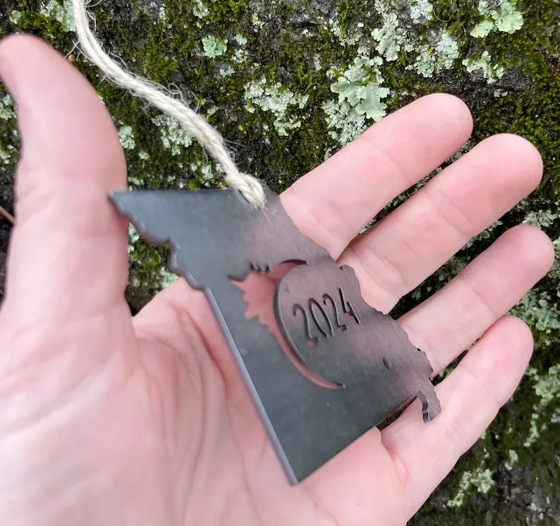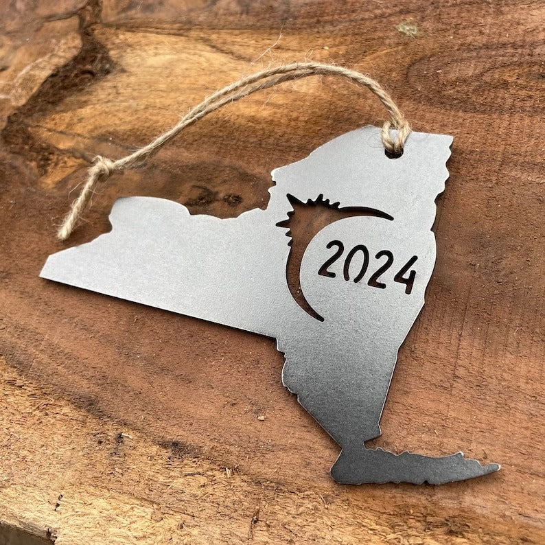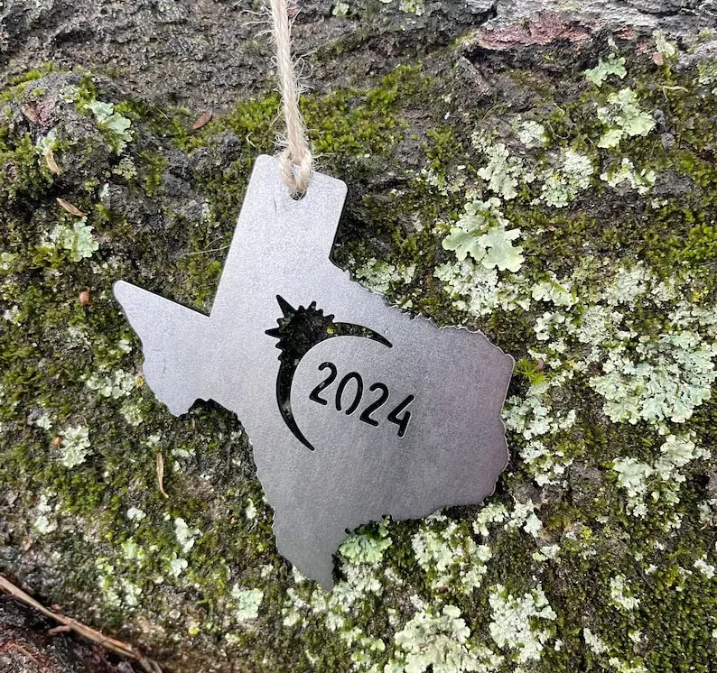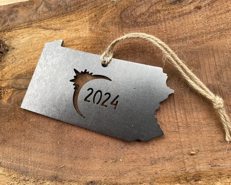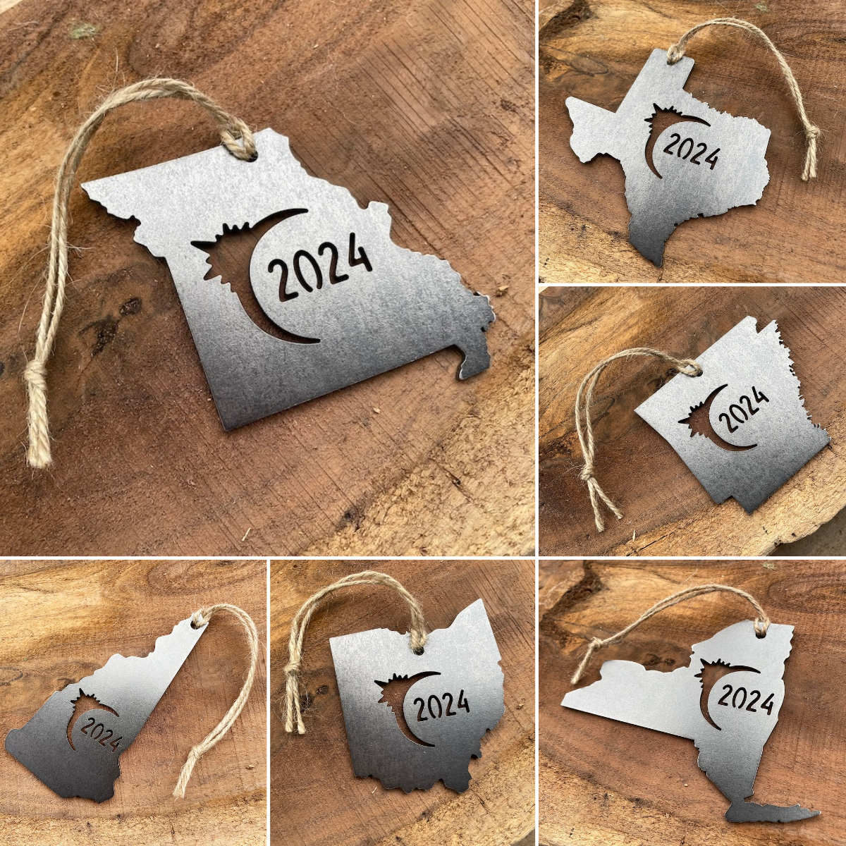 This metal ornament gift commemorates the April 8, 2024, total solar eclipse that spans North America.