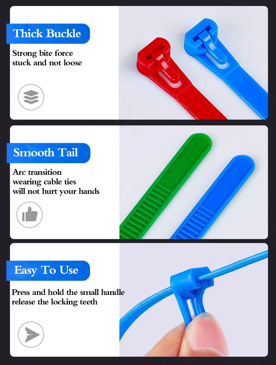 【Buckle self-locking design】 Each zip tie has a durable self-locking mechanism that locks very securely and will not budge over time, and the locking teeth stop the cable tie at the desired length. Easy to use and straight to the point. The loose buckle design is adopted, which solves the one-time use characteristic of ordinary cable ties, and the loose buckle design allows the cable tie to be reused.