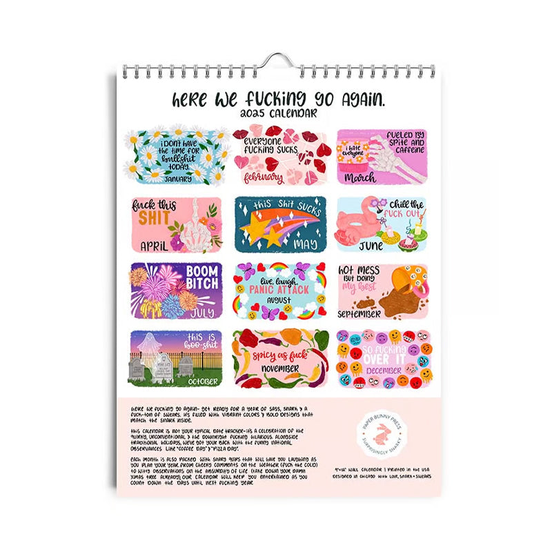 Here we fucking go again, get ready for a year of sass, snark and a fuck-ton of swears. This calendar is fulled with vibrant colors & bold designers that match the snark inside.