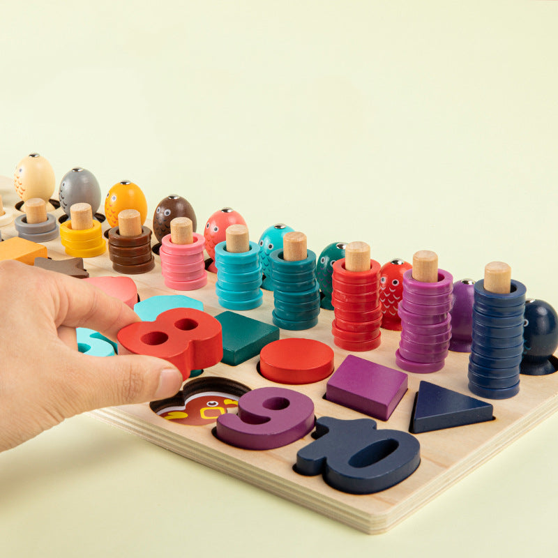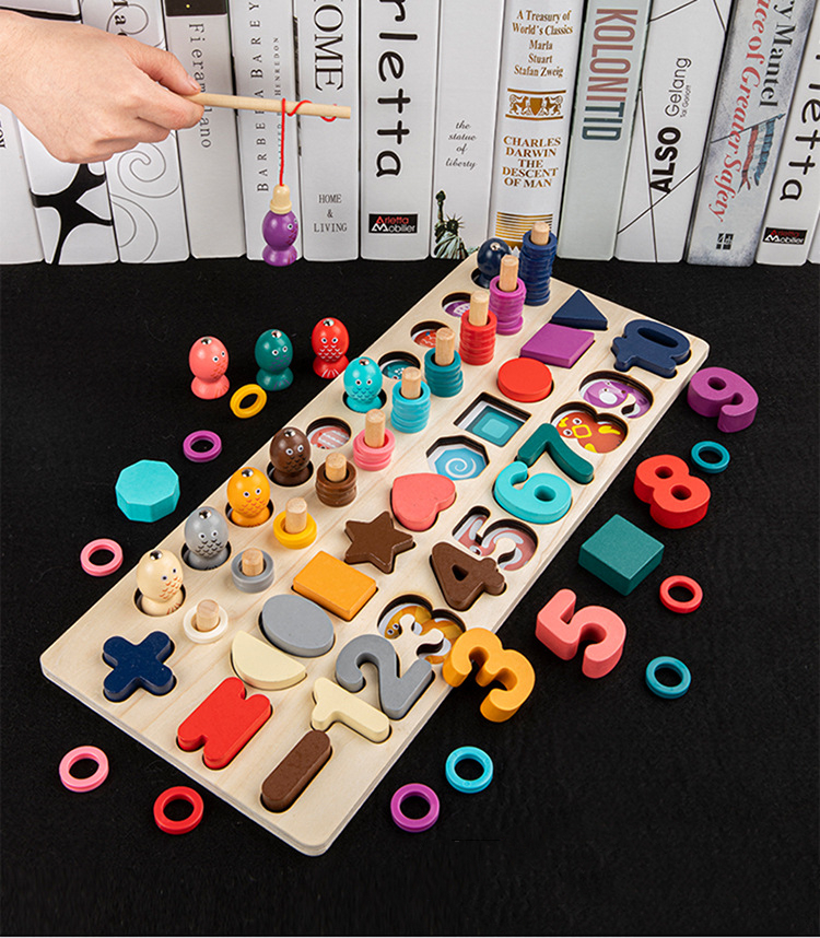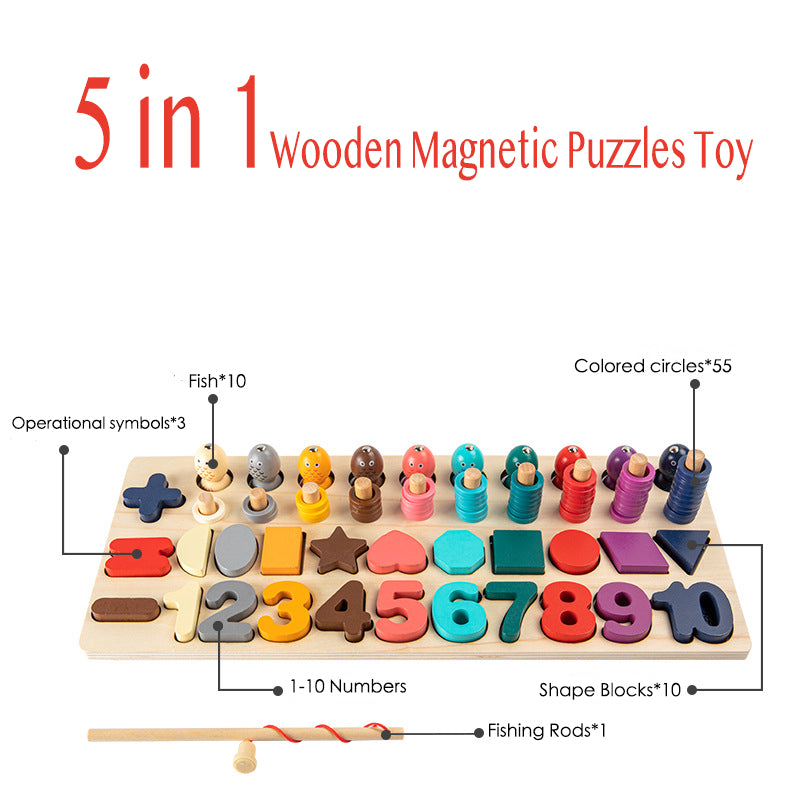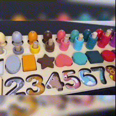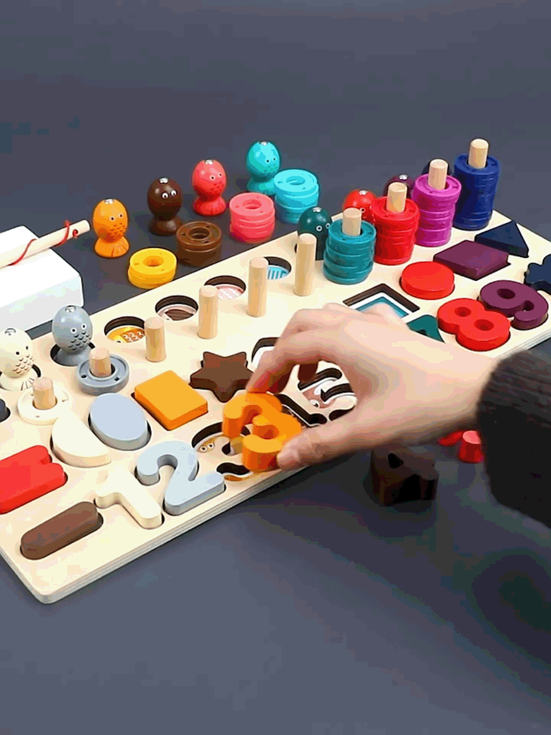 This is a joyful combo of multiple games with rich Montessori contents - kids will never get bored with the puzzle games when they enjoy sorting colors of the rings, counting the pieces, stacking blocks, naming the colors, fishing, simple math operation, putting the counter rings on the wooden pegs. It’s a gift toy for kids above 3 years old.